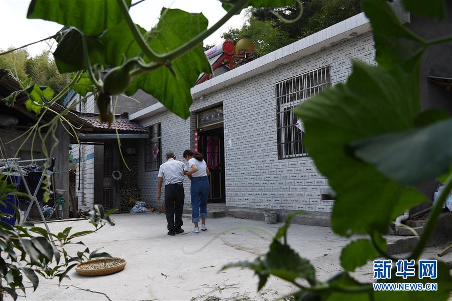 7月24日,张志菊陪伴着养父在自家庭院散步。