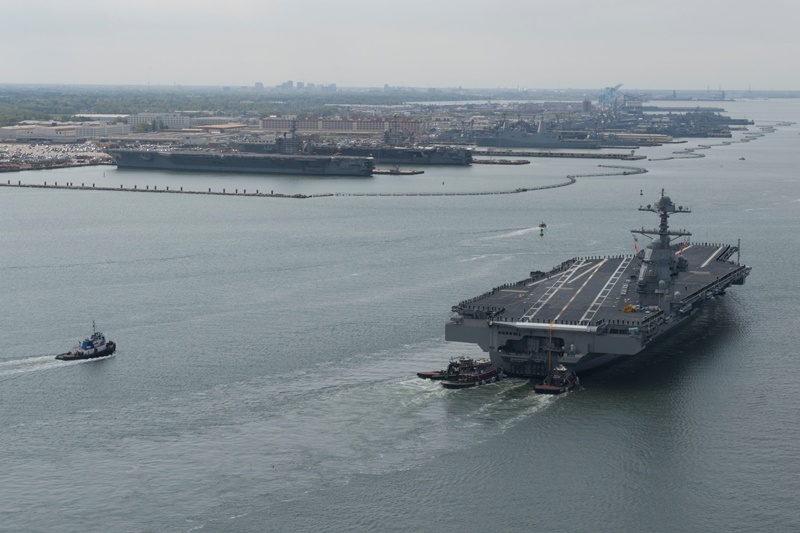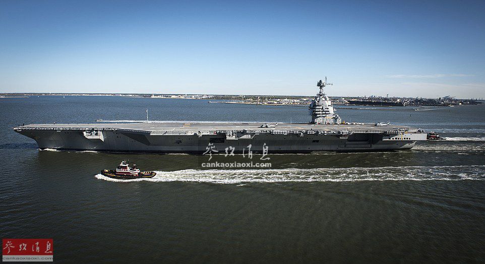“福特”号航母在拖轮护航下驶离港口。来源:参考消息网