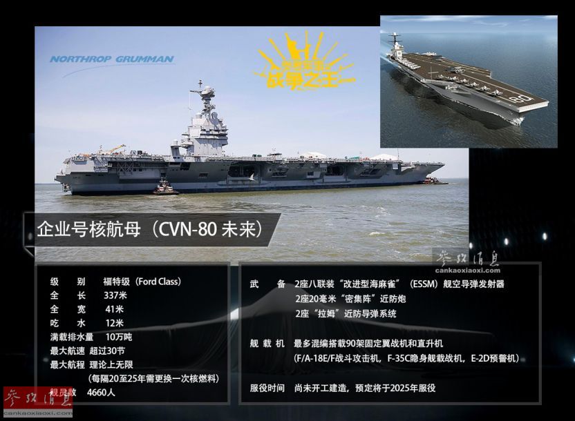 据美军公开资料,“企业”号(CVN-80)将成为福特级3号舰,目前虽还未开工建造,但美海军已提前为其预留了舷号。其配备有4台电磁弹射器,将搭载F-35C隐身战机和无人战机,小图为服役设想图。来源:参考消息网
