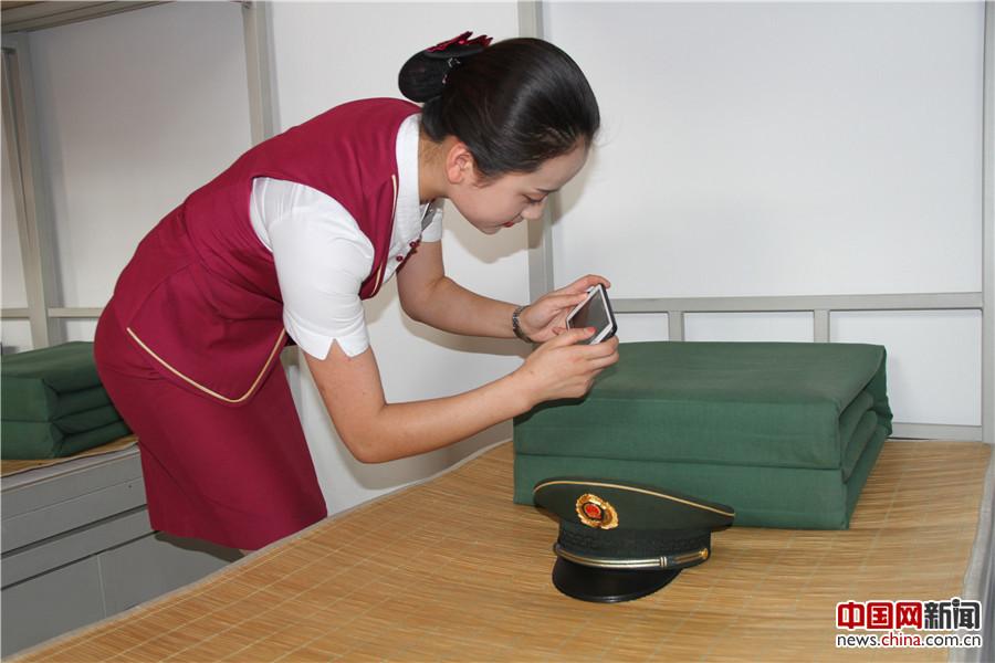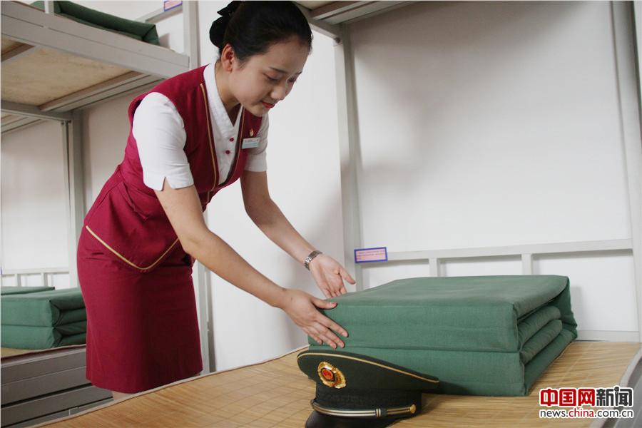 7月25日,北京客运段联合国旗护卫队开展了“迎八一爱国主义”活动,图为乘务人员参观内务整理。中国网记者 尚阳 摄