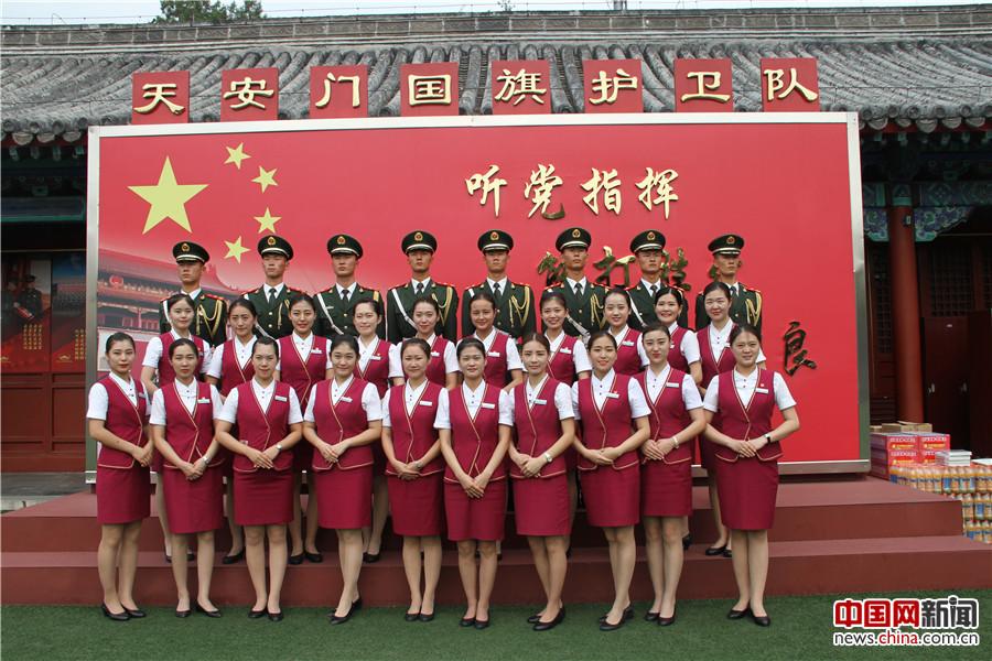 7月25日,北京客运段联合国旗护卫队开展了“迎八一爱国主义”活动,图为乘务人员与国旗护卫队合影留念。中国网记者 尚阳摄