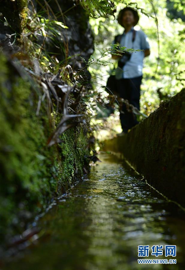 在湖北省恩施土家族苗族自治州宣恩县长潭河乡白果村,有一条长约7.5公里、悬于悬崖峭壁之上、被称为“深山天渠”的引水渠。行走在“深山天渠”之上,尽管外侧悬崖大多被生长起来的树木遮挡,但仍让人心惊胆寒。这条1957年开建、历时3年完工的水渠,至今仍是解决白果、洗马坪等3个村饮水及近千余亩良田灌溉的唯一水源。据参与水渠修建的当地村民介绍,紧贴峭壁的水渠在修建时,由村民腰缠绳索悬于绝壁上开凿炮眼,然后用黑火药爆破修建而成。数百村民吃住在山上,用不怕苦、不怕累、不怕牺牲的精神,开凿出这一土苗山乡绝壁引水的奇观。新华社发(宋文摄)