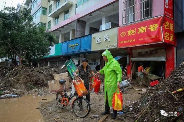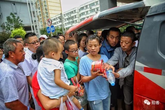 7月27日中午,榆林市绥德县,灾民在领取食物,每人一桶泡面、一根火腿肠、一瓶水。