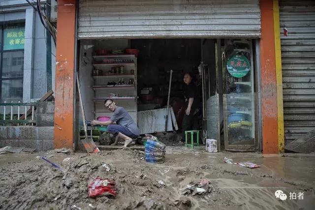 7月27日上午,榆林市绥德县,洪水过后,许多商户早早返回自家商铺进行自救,有人忙着在店铺前挖排水渠、有人忙着整理物品,看着“狼狈”的店面,大家显得颇为无奈、伤心。