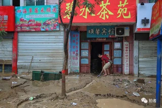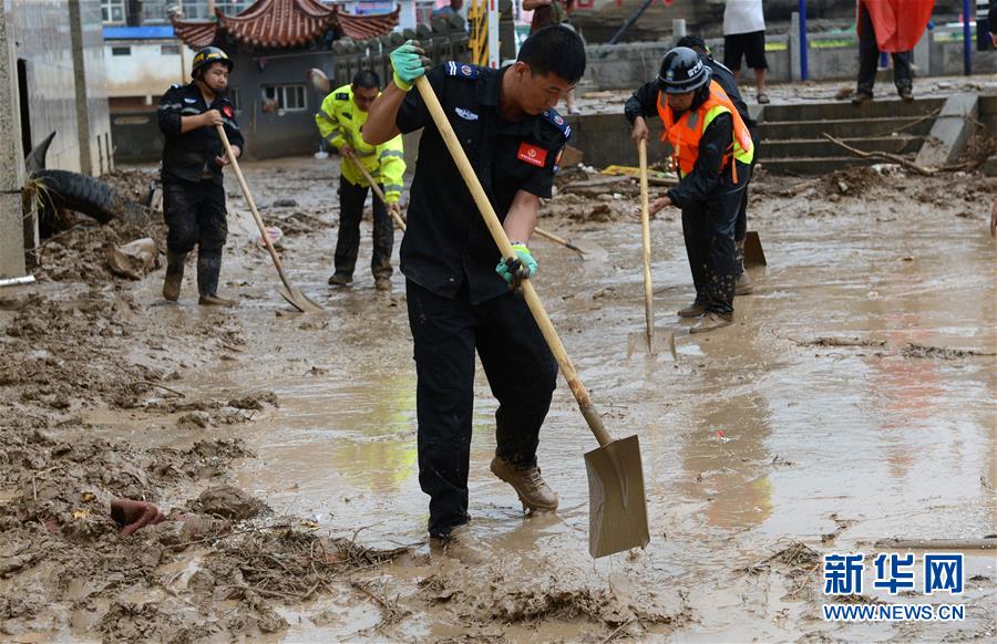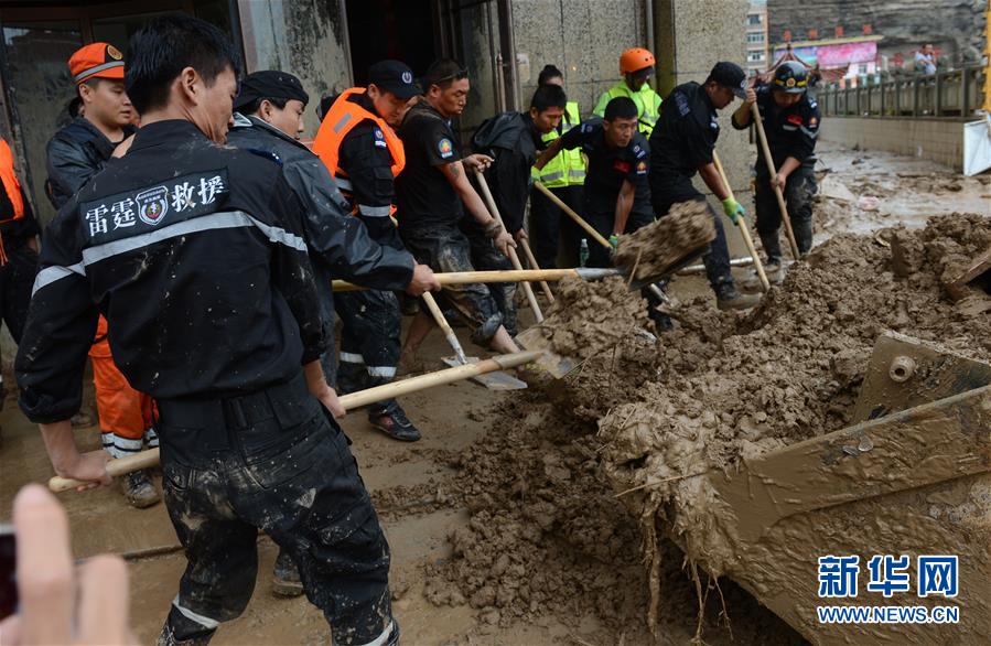 7月27日,救援人员在绥德县街头清除淤泥和杂物。