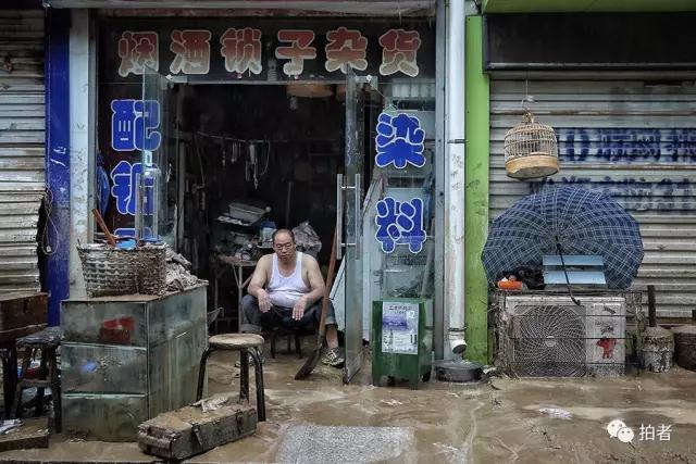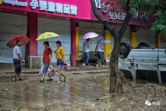 7月27日上午,当地居民在泥泞的街道上艰难前行,购买生活必需品。