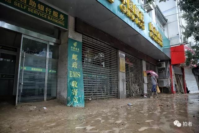 7月27日上午,中国邮政铁门上挂满了水草和杂物,一位市民经过时驻足观望。