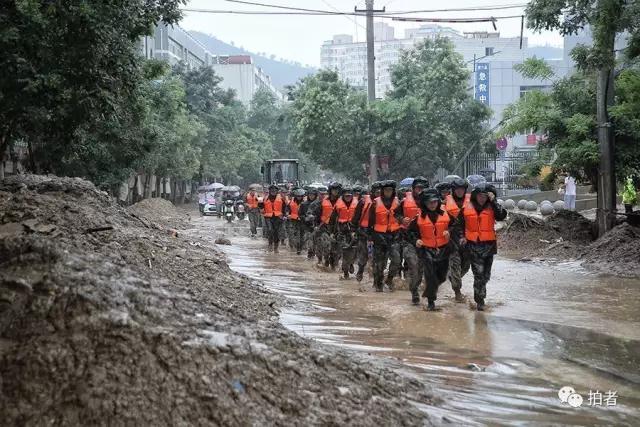 7月27日上午,绥德县文化大街,武警官兵前往执行救援任务的目的地。