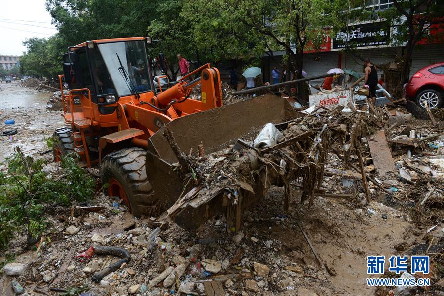 7月27日,救援人员驾驶大型机械在绥德县受灾道路上铲除淤泥和杂物。