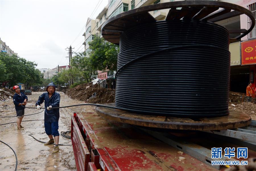 7月27日,电力工人在绥德县文化路冒雨架线。