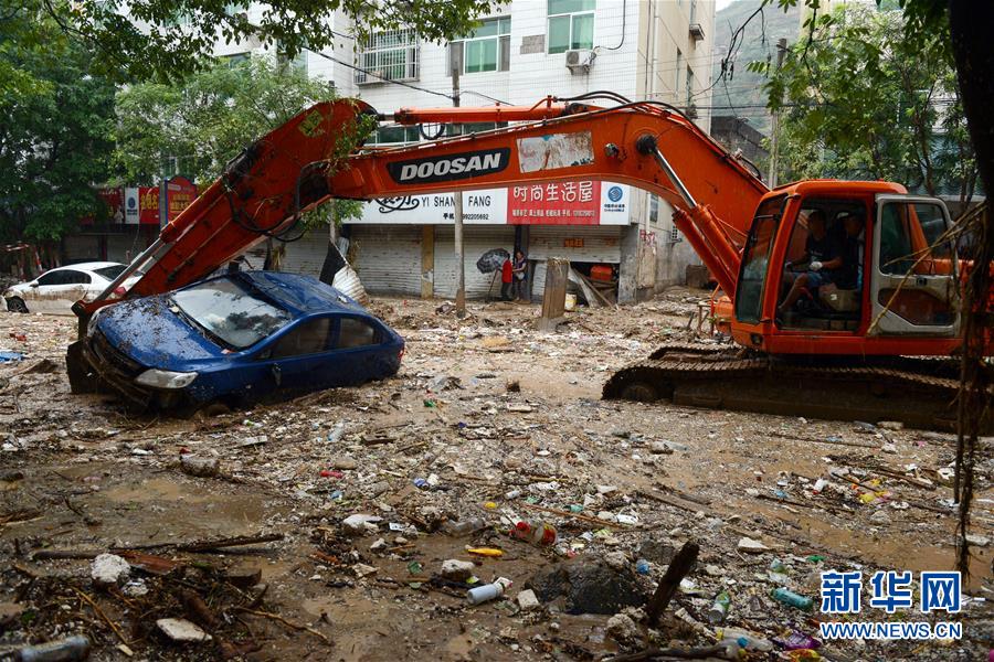 7月27日,救援人员驾驶大型机械在绥德县文化路清运损毁车辆。
