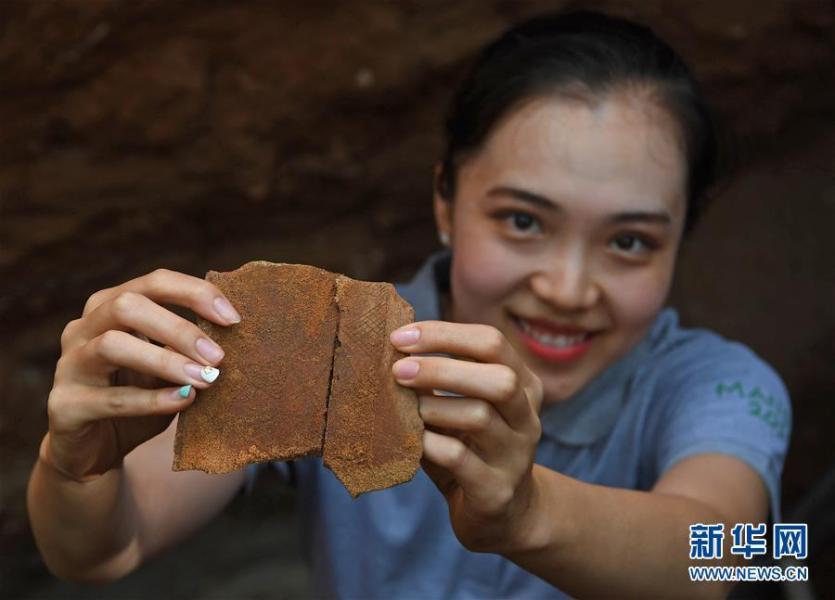 7月29日,参与发掘曼达岛遗址的中山大学队员在现场展示发掘的陶片。在肯尼亚拉穆郡曼达岛28日开幕的首届“古今中国与东非联系国际论坛”上,由中国、美国和肯尼亚专家组成的联合考古队宣布在曼达岛发现了具有中国血缘的3具人骨遗骸,其中一人可能生活在郑和下西洋的时代。新华社记者陈诚 摄