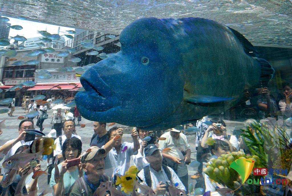 当地时间2017年7月31日,日本东京,主打冲绳海洋生物的2017年索尼水族馆展览举行,一只蓝色的苏眉鱼吸引民众围观。