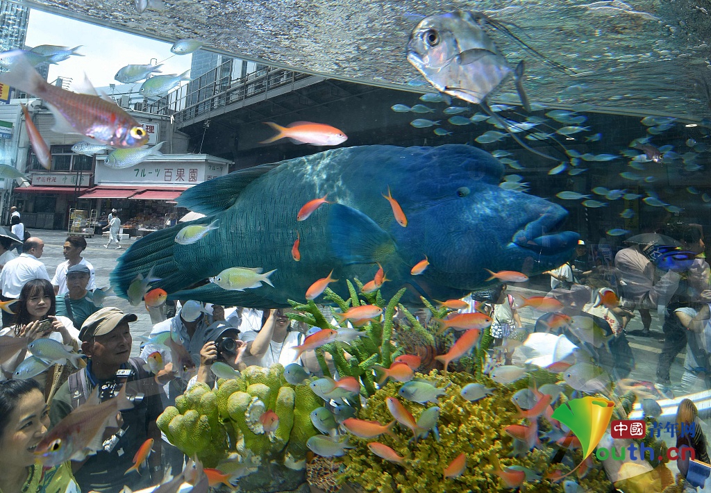 当地时间2017年7月31日,日本东京,主打冲绳海洋生物的2017年索尼水族馆展览举行,一只蓝色的苏眉鱼吸引民众围观。