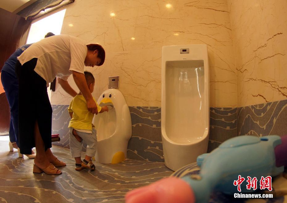 一位母亲带着幼儿体验儿童站式小便位。王昊阳 摄