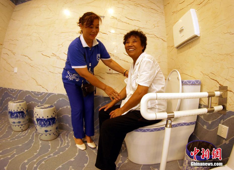 古窑工作人员将一位行动不便的游客引导到“第三卫生间”带有扶手的马桶旁。王昊阳 摄