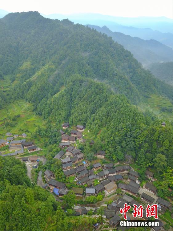 8月1日,航拍被青山环抱的传统村落格头苗寨。位于贵州省雷公山国家自然保护区和国家森林公园核心区腹地的格头苗寨,村境内秃杉群有3500余棵,千年秃杉200多棵,是目前中国仅存的面积最大,保存得最为完整的一片秃杉林,被誉为“中国秃杉之乡”。秃杉为第三纪古热带植物区孑遗植物,属国家一类保护植物,有林中“活化石”之称。秃杉苗名叫“豆机欧”,相传苗族祖先迁来时,直接以千年秃杉下弯的枝桠为梁,搭屋居住。秃杉保佑格头苗寨祖祖辈辈平安吉祥,是保佑格头人的神树,保护秃杉遗有古训,任何人不得以任何借口砍伐破坏苗寨的秃杉。中新社记者贺俊怡 摄