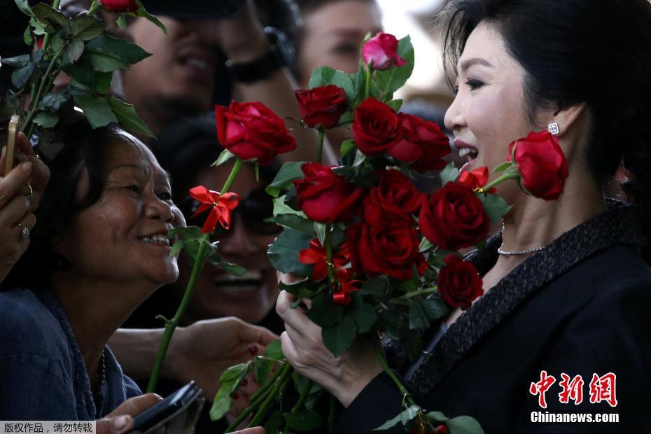 据了解,大米收购项目是英拉2011年上台后开始实施的一项惠农政策,但这一政策后来被批评导致粮食过度囤积和国家财政巨额亏空。2014年5月,泰国宪法法院以滥用职权、违反宪法为由解除英拉的总理职务。图为不少人送上玫瑰花。