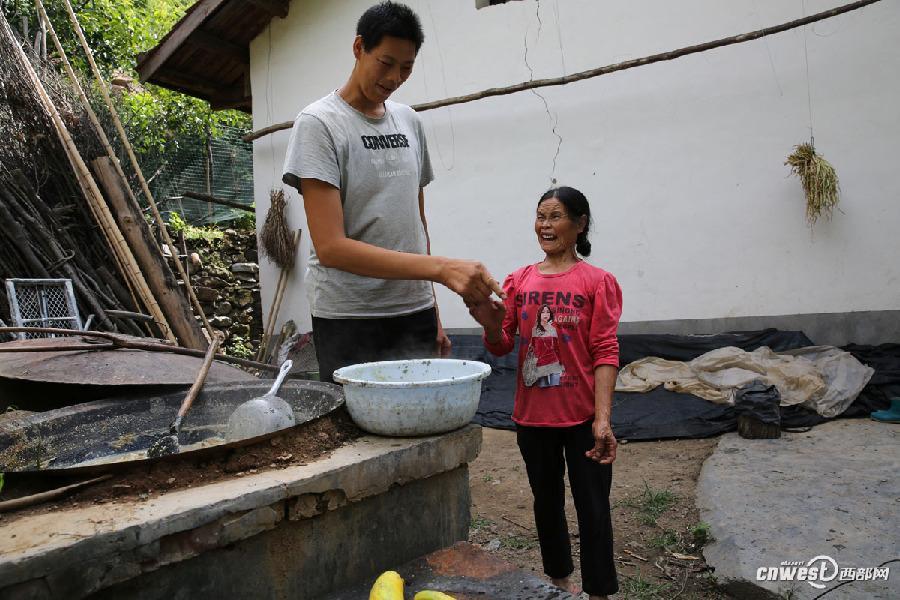 任能兵和母亲一起准备猪食,他们家养了3头猪。因母亲是聋哑人,任能兵和母亲用手语交流。记者 魏永贤 图片来源:西部网