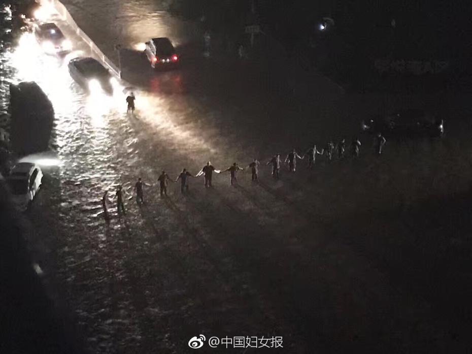 北京暴雨街道被淹 武警手拉手筑成人墙防车辆前行