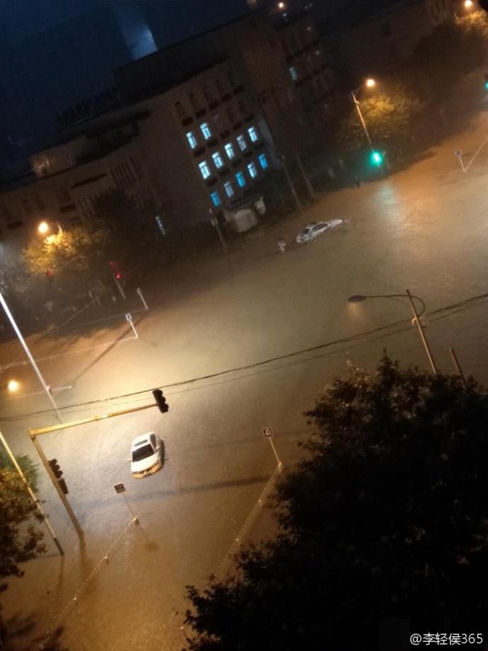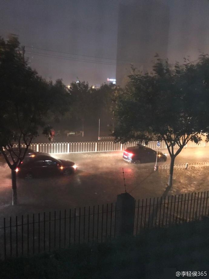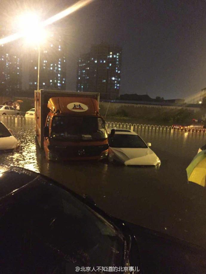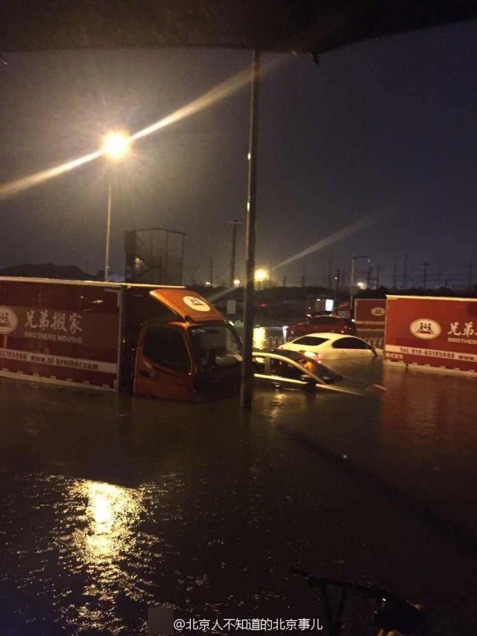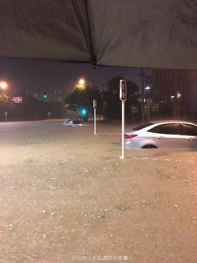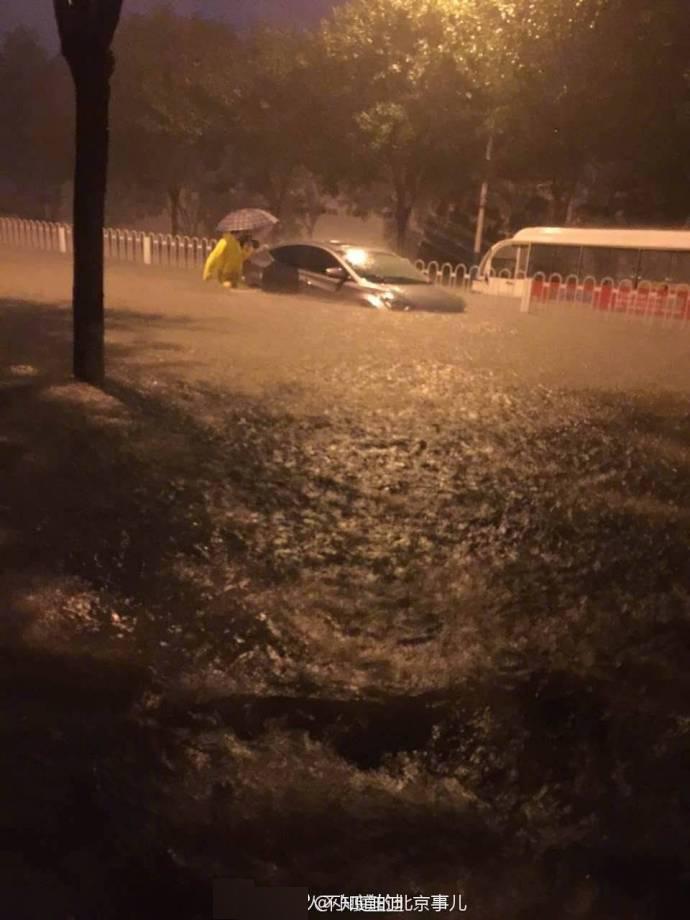 2017年8月2日21时许,北京市房山区长阳镇长泽南街(北京四中房山校区西北角)因暴雨淹没道路,最深的路段已有车辆停在路中间无法挪走。