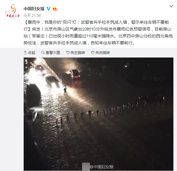 为避免车辆进入深水路段,武警官兵手拉手筑成人墙,警示来往车辆不要前行。图片来源:《中国妇女报》官微