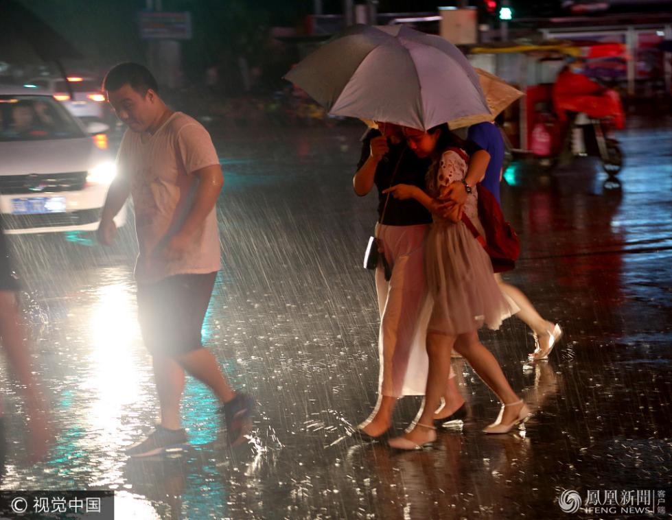 2017年8月2日,北京,一场如期而至的雷阵雨降落京城,北京部分地区街道被淹。北京四中房山分校的西北角地势低洼,武警手拉手筑成人墙,告知来往车辆不要前行。???