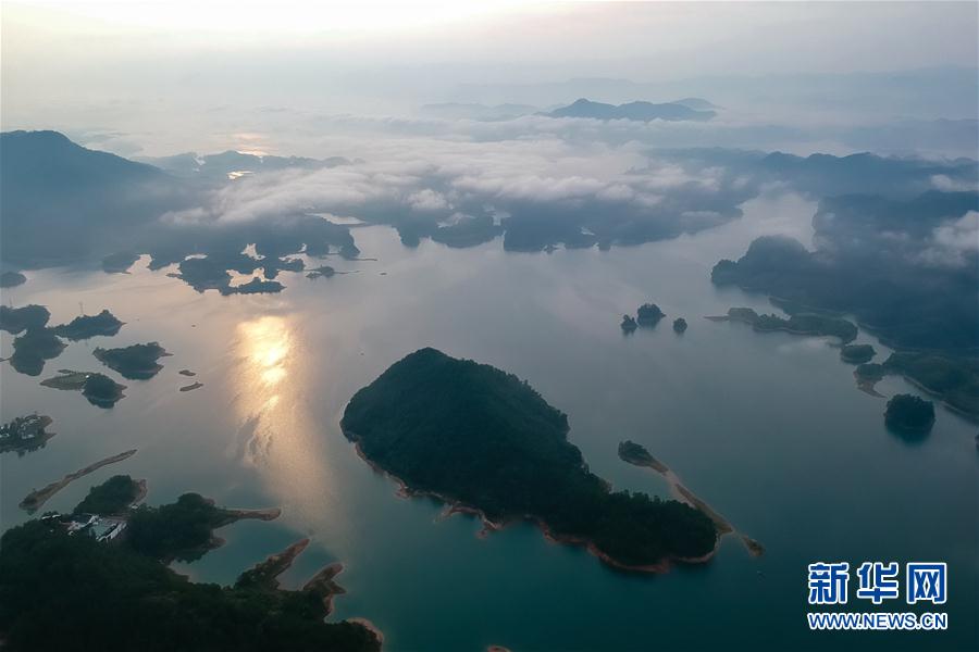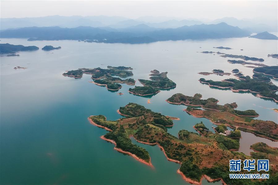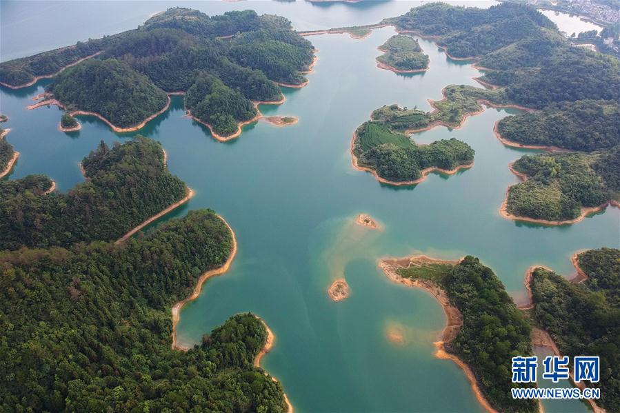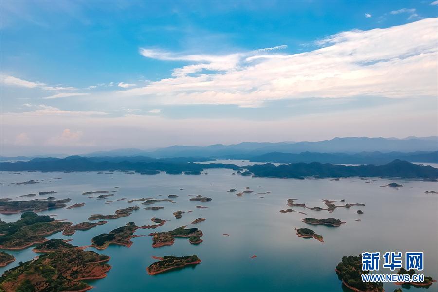 这是8月8日航拍的千岛湖景色。立秋以来,位于浙江省淳安县的千岛湖景色优美。淳安县近年来以“绿色发展”为指引,不断推进生态保护,让“绿水青山”成为当地发展的新名片。新华社记者张铖 摄