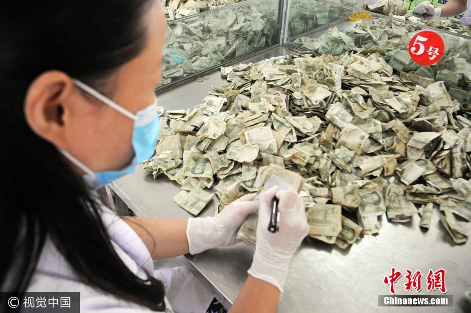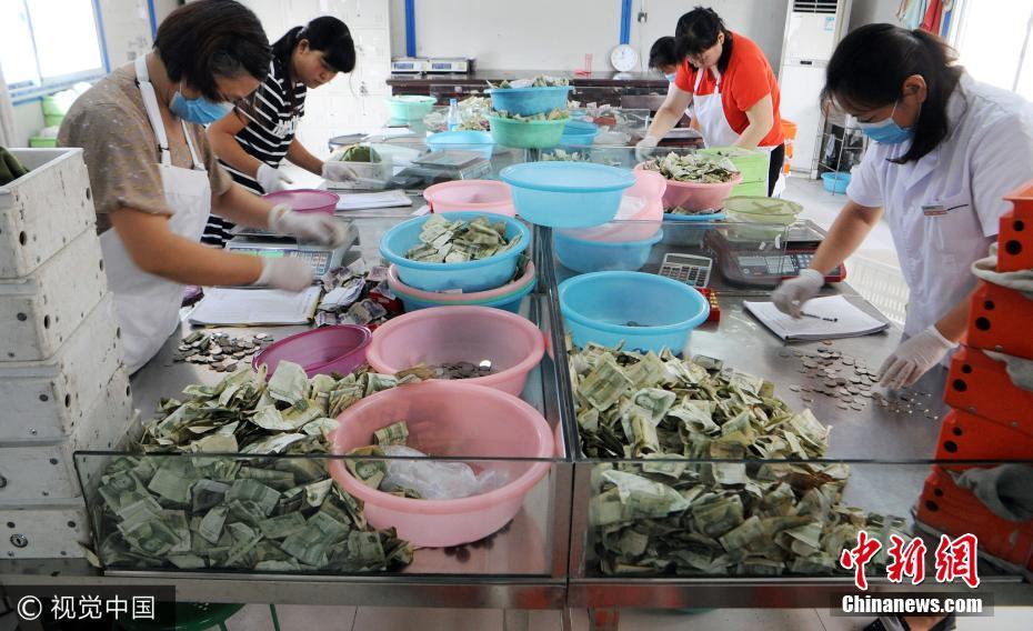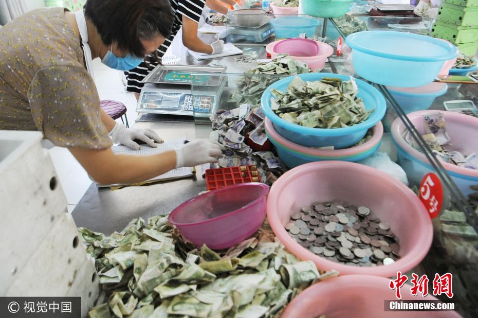 2017年8月10日,安徽毫州公交公司点钞员正在清点满桌零钱。当日,安徽省亳州市公交公司举行职工点钞技能比赛,8名参赛的点钞能手准确进行各种面值的纸币、硬币的分类清点的同时,还要区分出残币和假币,限时内点钞速度最快、点钞数量最准确的选手获胜。通过比赛,旨在提高公司财务相关人员业务技能,夯实业务基础,最大限度地调动员工的学习积极性和提高业务基本能力。张延林摄 图片来源:视觉中国