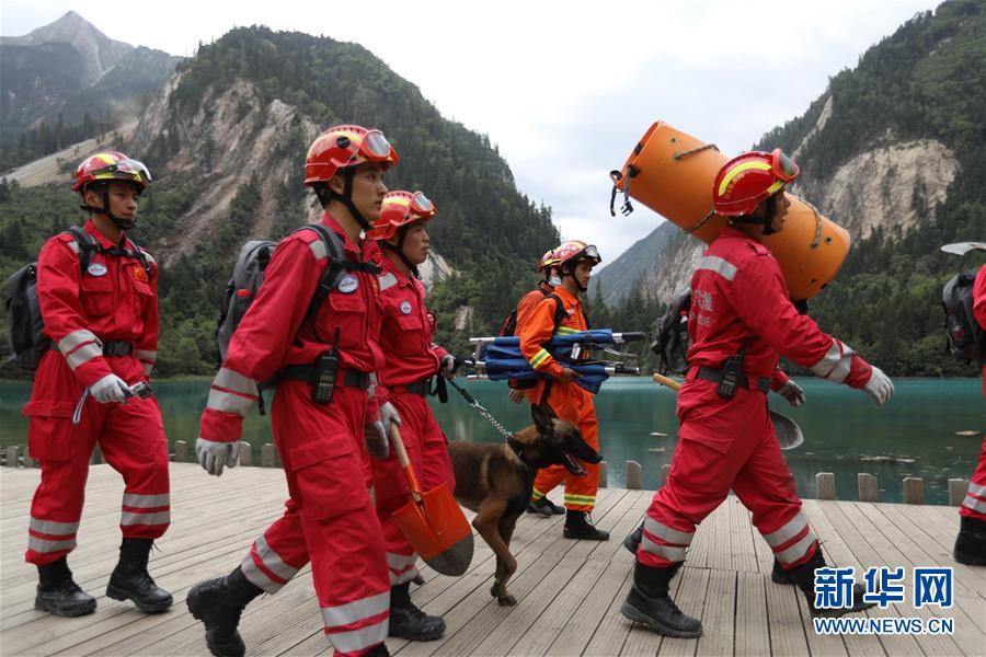 8月12日,紧急救援队员在前往九寨沟景区熊猫海途中。当日,由中国国际救援队和四川武警广元消防支队等组成的九寨沟地震紧急救援队又一次派出20余人,前往九寨沟景区熊猫海附近,继续寻找失联人员。新华社记者江宏景 摄