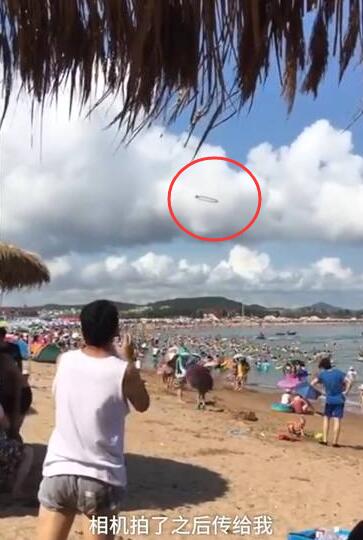 8月12日14时45分,在辽宁大连金石滩景区,一个黑色“烟圈”悬在空中,由椭圆形逐渐变成平行四边形,快速移动穿过云层后消失。