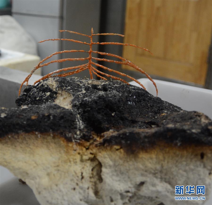 “发现”号采集到的一块岩石上附着一株珊瑚(8月14日摄)。