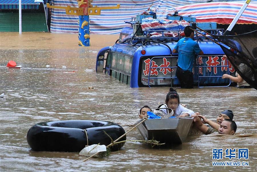 8月13日,在广西柳州市融水苗族自治县杆洞乡,救援人员转移被洪水围困的居民。