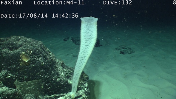 8月15日报道,中国新一代远洋综合科考船“科学”号正在西太平洋卡罗琳海山进行科学考察。科学家利用“发现”号遥控无人潜水器吗,并对海山进行了精细调查,拍摄大量视频和图片。图为海山的偕老同穴海绵。图文:新华社徐奎栋 摄