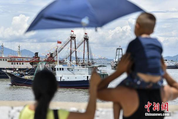 8月16日,渔港停满了准备出海的渔船。当日,南海伏季休渔期结束,千艘渔船从广东阳江海陵岛闸坡国家级中心渔港出发,投入新一轮的耕海征程。图为一位市民在岸边眺望驶离港湾的渔船。中新社记者陈骥旻 摄