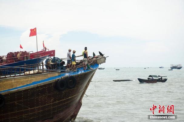 在三亚崖州中心渔港渔民正在给渔船刷漆,为开渔做准备。骆云飞 摄