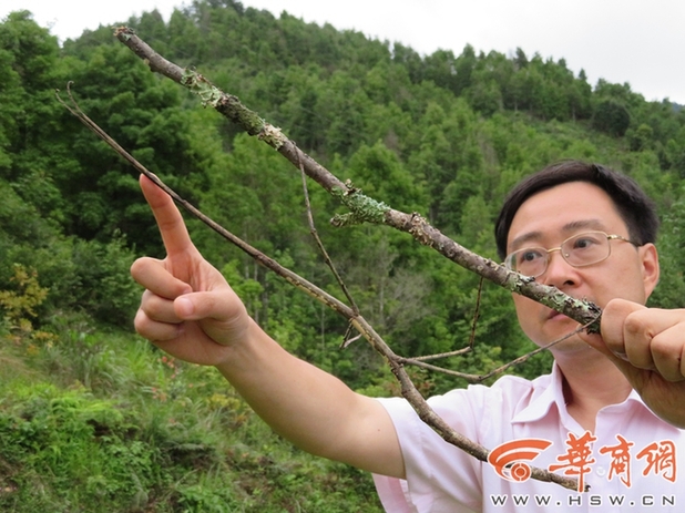 巨型竹节虫模仿环境的水平直追变色龙。另外,它们在遇到攻击时,还有一个绝招,就是将六条长腿并成一条直线,像箭一样穿过茂密的枝叶,垂直落向地面,这个招数往往能够让它们绝处逢生。图为赵力在广西北回归线附近山地考察中国巨竹节虫生境。