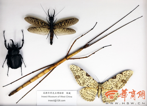 今年7月底,我国人工繁育出了一只全长达64厘米,身体长度达38.2厘米的中国巨竹节虫。因国际通行衡量昆虫体型的方式系按照身体长度或翅展宽度,所以该个体是世界已知现存最大昆虫个体。图为中国巨竹节虫最大个体和另外几种昆虫世界之最(由上到下分别为:世界最大水生昆虫——越中巨齿蛉,世界最重昆虫——亚克提恩大兜虫,世界翅展最宽昆虫——白女巫夜蛾)