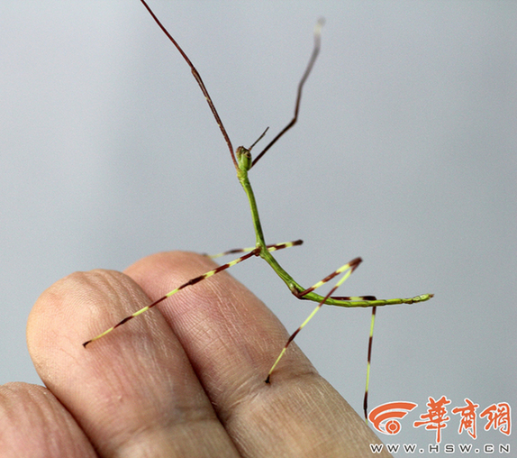 这只巨虫带回博物馆后,产下了一些卵,让我们有机会人工繁育这个神奇的物种。一只雌性中国巨竹节虫一生可以产下300-400枚卵,刚刚孵化的幼虫身体长度就可以达到3.5厘米,全长6厘米左右,这个长度已经和许多成年昆虫相当,比世界上最小竹节虫成年个体还大(最小竹节虫种类为北美洲的Timema cristinae,成年个体仅1.3厘米)。图为刚刚孵化的中国巨竹节虫一龄幼体。