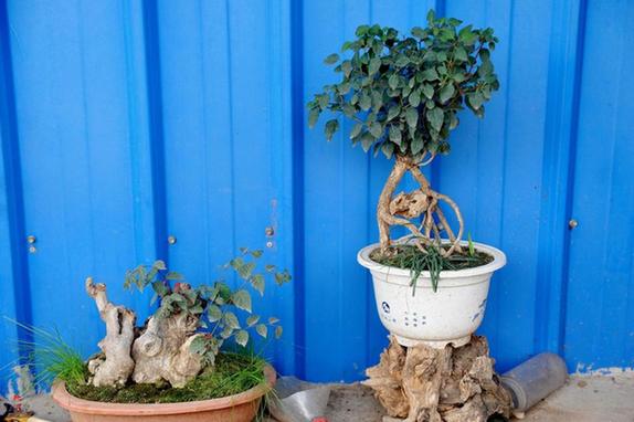 图为彩钢房外摆放的燕超制作的植物盆景。“我一个一起学盆栽的朋友上个月卖出了几盆,挣了3千多块钱。种西红柿前后也就半年时间,剩下的时间我就想做这个,要是做好了,也是一门长期挣钱的手艺,比外出打工强”。