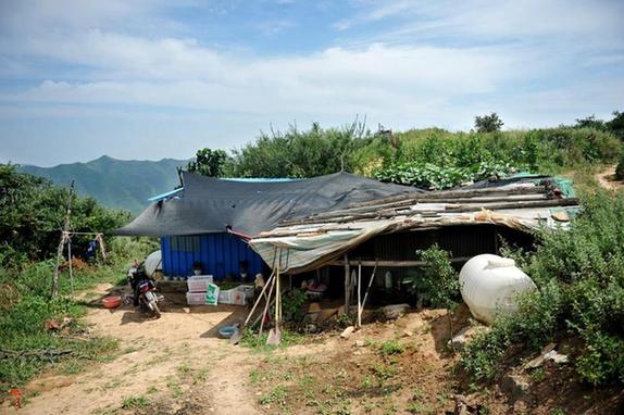 “我们家也在山下盖了房,但为了种山上的西红柿,就在地边上盖了座简易的彩钢房。平时,我住在里面看护着,最近西红柿开始成熟,为便于采摘和销售,我们全家就都搬到了山上”,燕超介绍,“我和妈妈、弟弟负责摘,爸爸负责用三轮车拉到山下去卖,这几天熟得多,一天要摘好几千斤,很忙”。图为燕超家在西红柿地边盖的彩钢房。房子盖在山顶,四周三四里地再没有人烟。