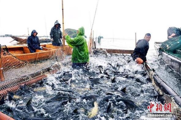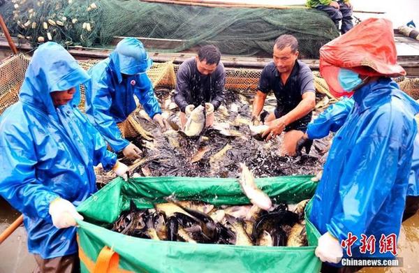 来自浙江、福建等地客商十多辆卡车等候在码头边,将捕捞上来的十万多斤活鱼运往全国各地。