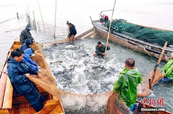 江西省九江县赤湖管理处一水产养殖场6000亩围栏水面开始捕捞。