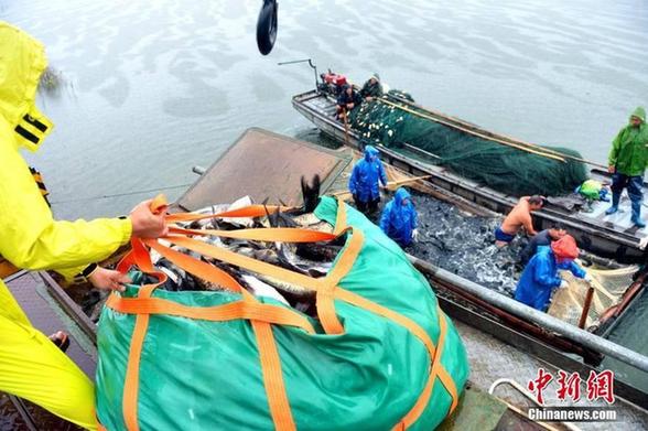 8月15日,江西省九江县赤湖管理处一水产养殖场6000亩围栏水面开始捕捞,拉开了当地秋季捕鱼的序幕。当天,来自浙江、福建等地客商十多辆卡车等候在码头边,将捕捞上来的十万多斤活鱼运往全国各地。赤湖拥有6万亩水面,环境优美,水质常年保持在3级以上,产自赤湖的鲜鱼远近闻名,深受大众欢迎,产品供不应求。杨风胜摄