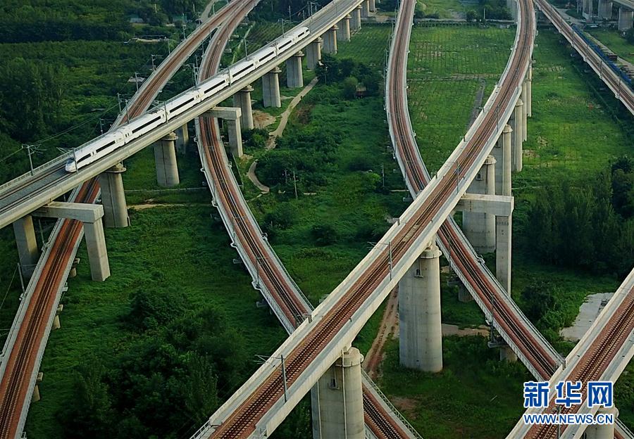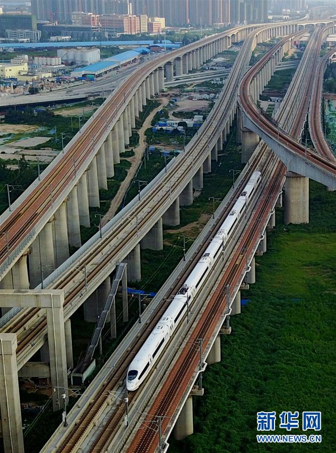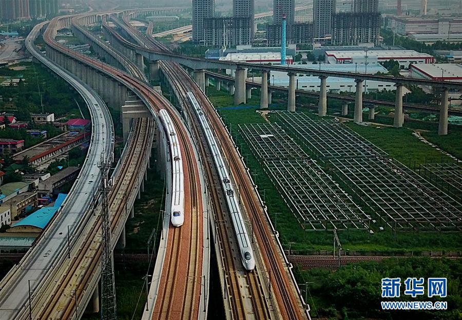 一列动车组列车从郑州市区内纵横交错的高铁线路中穿过(8月17日摄)。新华社记者李安摄