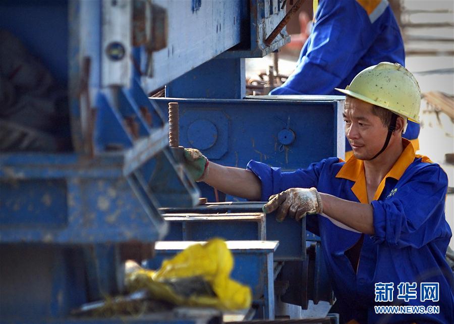施工人员在郑阜高铁先开段跨商周高速连续梁施工现场作业(8月15日摄)。新华社记者李安摄