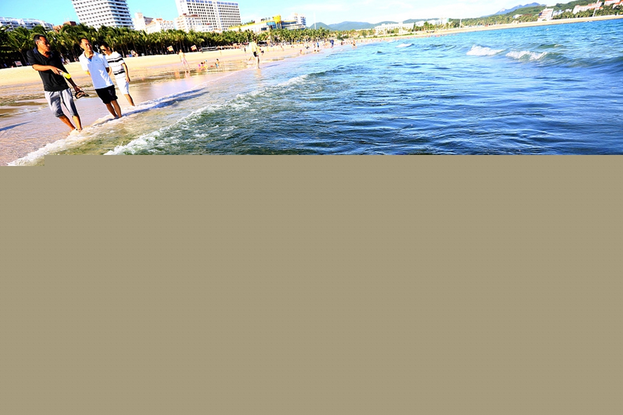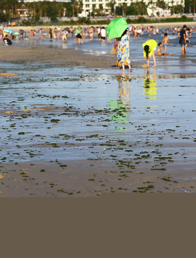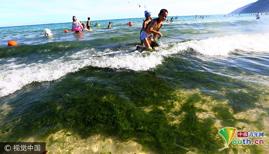 2017年8月20日,海南三亚,游客在大东海海滩游玩。近日,三亚市大东海海滩出现大量绿藻。