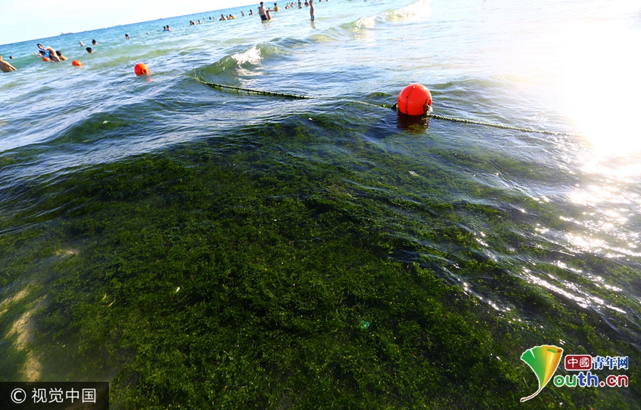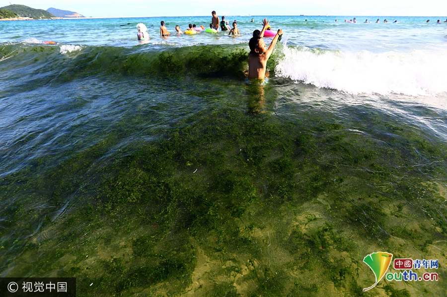 海南三亚大东海遭绿藻“入侵” 游客依旧下水沉浮