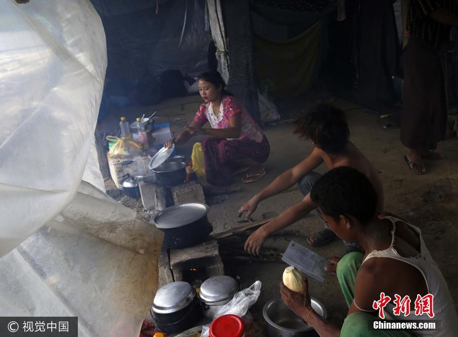 简易棚外边,一名工人在砍柴火,棚内,炊烟四起,靓丽的掸邦女孩和几名小伙子生火做饭。