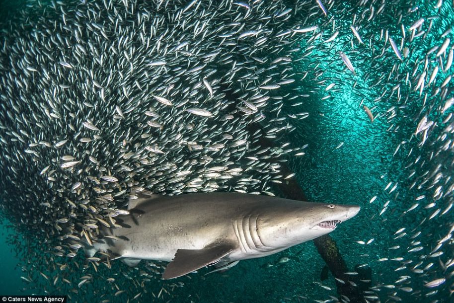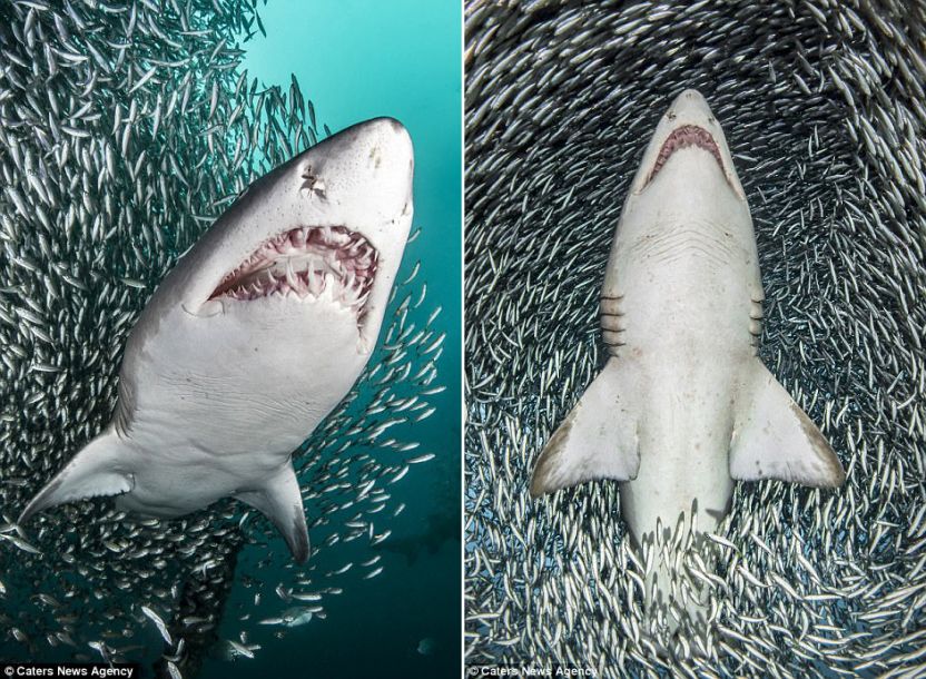 然而沙虎鲨淡定地穿过这些小鱼,颇有“万鱼丛中过 片鳞不沾身”的风骨。